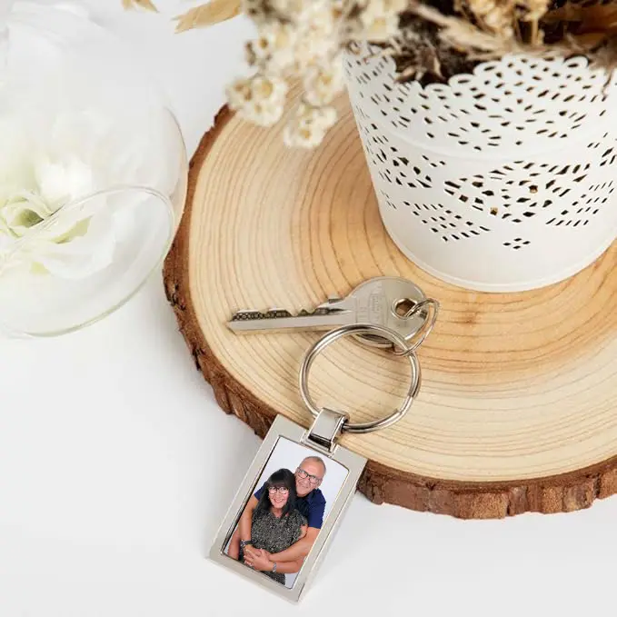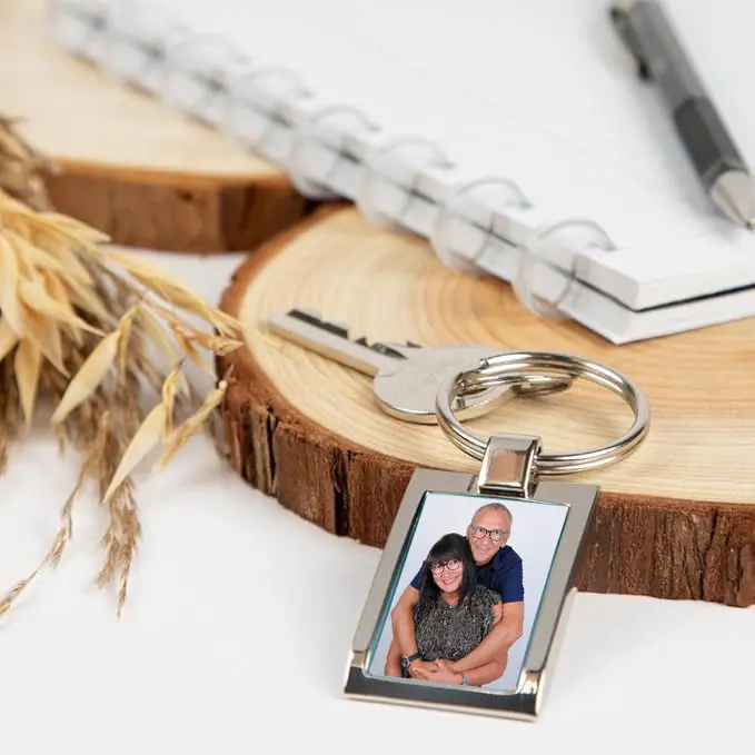 Emportez vos souvenirs partout avec le porte-clé photo personnalisé. Conçu comme un mini cadre élégant, il accueille votre photo au format identité et se fixe facilement grâce à son anneau solide.